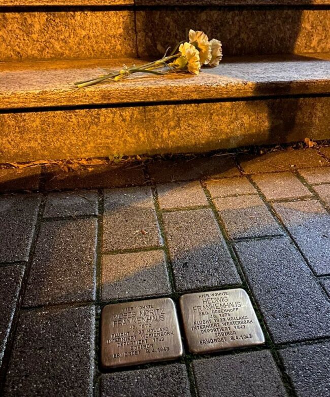 In der Nacht vom 09. auf den 10. November 1938 fanden die Novemberprogrome statt. Deutschlandweit wurden Orte des jüdischen Lebens angegriffen und zerstört, hunderte Jüdinnen und Juden ermordet. In den kommenden Jahren ermordete das nationalsozialistische Regime über sechs Millionen Jüdinnen und Juden. Moses Moritz Frankenhaus*1872Flucht 1933 HollandInterniert WesterborkDeportiert 1943SobiborErmordet 09.04.1943 Hedwig Frankenhaus*1875Flucht 1933 HollandInterniert WesterborkDeportiert…